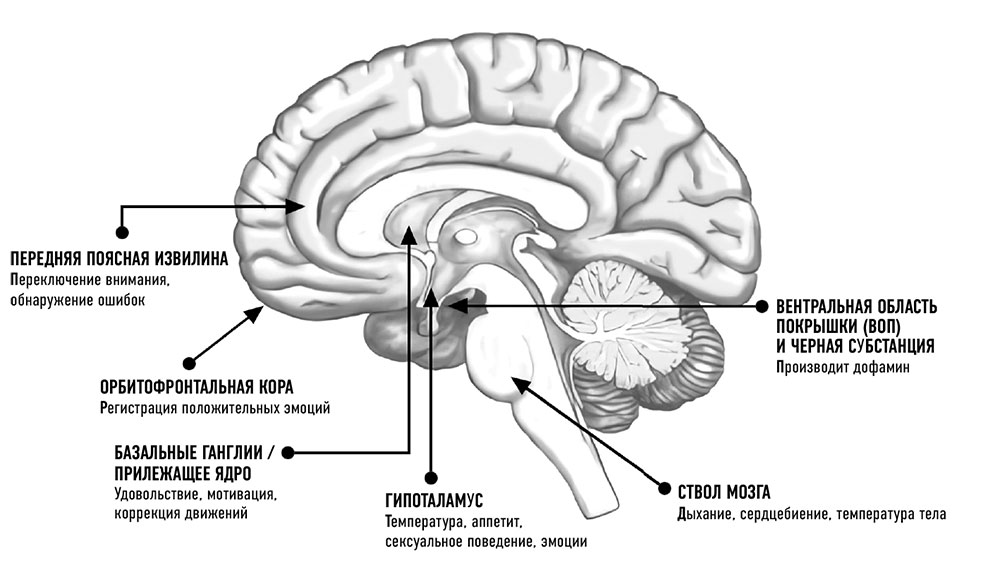 Базальные ганглии – это крупные структуры в глубине мозга, которые отвечают за желания, мотивацию, формирование привычек и моторику. Там находится прилежащее ядро, часть системы вознаграждения, которое мотивирует вас выполнять собственные желания и избегать боли. Прилежащее ядро крайне чувствительно к нейромедиатору дофамину, который связан с тягой и зависимостью. При недостаточной активности прилежащего ядра люди чувствуют себя подавленными и депрессивными, становятся более уязвимыми к зависимостям, их тянет к тому, что может активизировать этот участок мозга, например к наркотикам, алкоголю, сексу или высококалорийной сладкой пище. Дофамин вырабатывают черная субстанция, часть базальных ганглиев, и вентральная область покрышки, которая находится рядом со стволом. Когда одна из этих областей недостаточно активна или начинает отмирать, уровень дофамина снижается, и у людей развивается болезнь Паркинсона, апатия и часто депрессия.