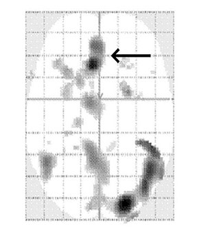 Стрелка указывает на активные области передней поясной извилины группы с низким уровнем счастья