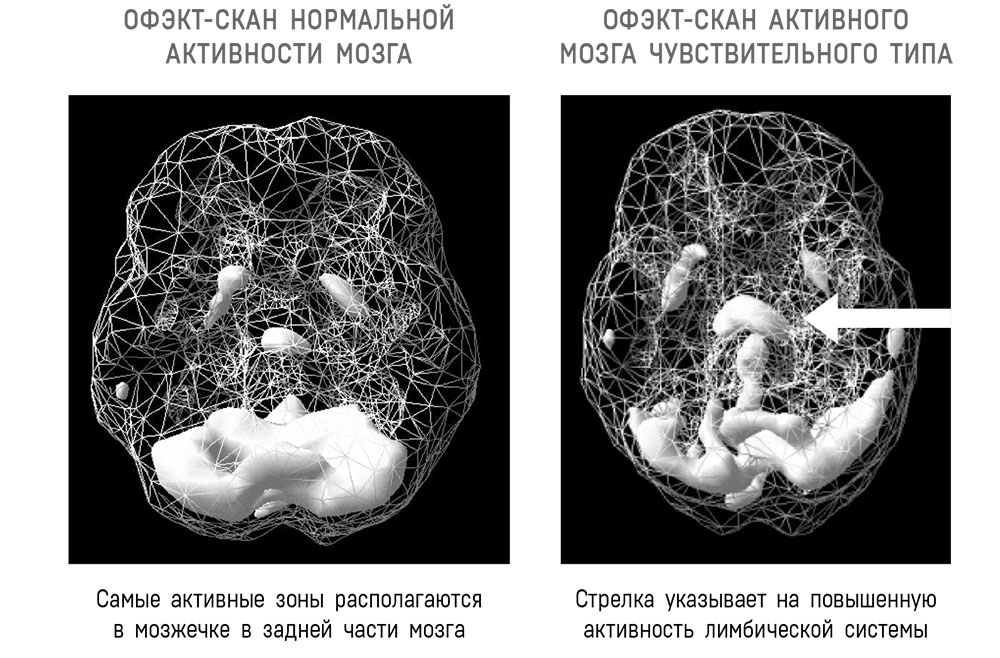 Что показывает офэкт-сканирование чувствительного типа мозгаСканирование показывает, что у людей с Чувствительным типом мозга зачастую повышена активность в лимбической, или эмоциональной, области мозга.