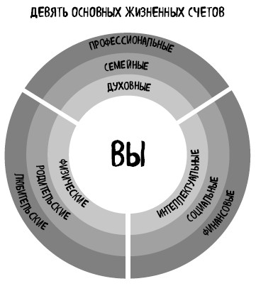 Определите свои жизненные счетаБольшинство людей могут разделить свою жизнь на семь-двенадцать сфер. Мы называем эти сферы жизненными активами. За долгие годы консультирования нам удалось выявить девять наиболее распространенных.