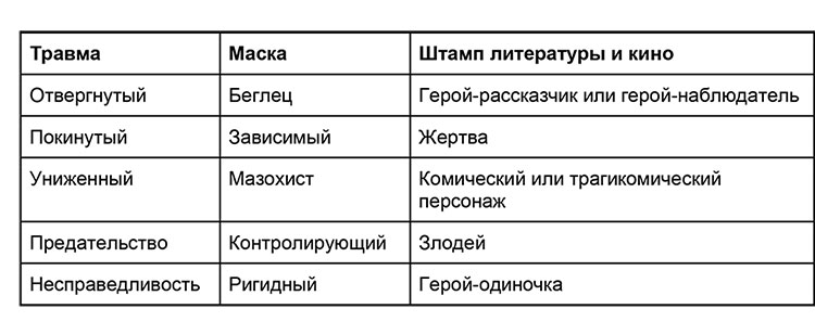 Если главный герой имеет очевидные внутренние проблемы, то чаще других его маской становится ригидность. Травма несправедливости – самая зрелая из всех травм, она активируется и развивается позже остальных. Ригидный персонаж, даже если он далеко зашёл в наращивании маски, смотрится взрослее, чем Зависимый, Беглец или Мазохист.