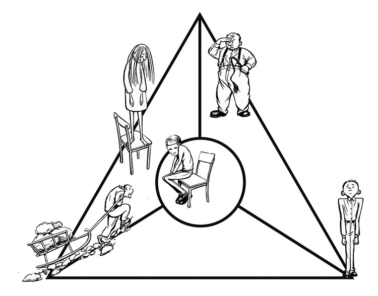 И ещё один любопытный момент. Во многих книгах и фильмах важной составляющей сюжета (а иногда – его основой) служит классический манипулятивный треугольник Карпмана (Жертва, Каратель, Спасатель). Можно рассмотреть этот треугольник через призму Типологии пяти травм.