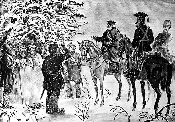 Двадцать первого пришло мне повеление расстрелять преступника, и тот же час разослано от меня объявление по всем деревням на расстоянии десяти верст, чтобы крестьяне собирались в Городище. Четыре священника ближних сел туда же приглашены были. 22‐го, поутру, преступника исповедали, надели на него белую рубашку и привели под караулом к самой той церкви, которую он грабил с врагами отечества. Священники стояли перед нею лицом в поле; на одной черте с ними – взвод пехоты. Преступник был поставлен на колена, лицом к священникам, за ним народ, а за народом вся партия – полукружием. Его отпевали… живого. Надеялся ли он на прощение? До верхней ли степени вкоренилось в нем безбожие? Или отчаяние овладело им до бесчувственности? Но вовремя богослужения он ни разу не перекрестился. Когда служба кончилась, я велел ему поклониться на четыре стороны. Он поклонился. Я велел народу и отряду расступиться. Он глядел на меня глазами неведения; наконец, когда я велел отвести его далее и завязать глаза, он затрепетал… Взвод подвинулся и выстрелил разом. Тогда партия моя окружила зрителей, из коих хотя не было ни одного изменника и грабителя, но были ослушники начальства. Я имел им список, стал выкликать виновных поодиночке и наказывать нагайками.