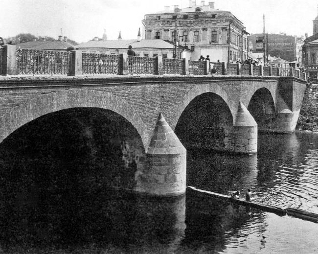 В 1783–1786 годах по приказу императрицы Екатерины II был проложен Водоотводный канал по заболоченной старице Москвы-реки. Первый деревянный мост на месте Малого Каменного перекинули через канал в 1788 году. Он назывался Козьмодемьянским (Космодамианским) по церкви Космы и Дамиана в Кадашах, о которой уже не раз упоминалось. Стоит отметить, что еще в XVI и XVII столетиях здесь существовала скромная деревянная переправа через старицу. В 1880 году мост построили в камне, и он получил современное название. Малый Каменный мост состоял из трех пролетов примерно по тринадцать метров каждый. Ширина проезжей части составляла четырнадцать с половиной метров, справа и слева от нее располагались двухметровые тротуары.