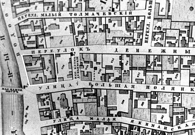 Любопытно, что в 1860-х годах западное владение принадлежало княжне Надежде Алексеевне Трубецкой – двоюродной сестре «двоеженца» Петра Петровича. Она была последней представительницей княжеского рода Трубецких среди собственников исследуемой территории. В начале 1870-х годов западную и южную усадьбы приобрела Елизавета Петровна Кичеева, продавшая их через пару лет Софье Алексеевне Брянской. Дворы объединили в одно огромное владение, в плане напоминавшее букву «Г». В это время линия застройки со стороны Большой Полянки замкнулась – остался лишь узкий проезд. В Старомонетном переулке возвели двухэтажный каменный дом с проездной аркой и двумя корпусами, примыкавшими к тыльной стороне. В нем устроили недорогие доходные квартиры. Это здание (Старомонетный переулок, № 4, стр. 1) – единственный уцелевший исторический дом на территории трех погибших городских усадеб.