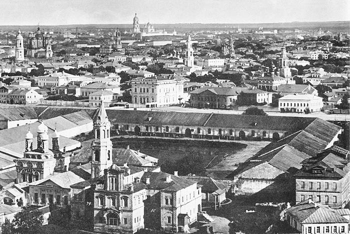 Панорама с храма Христа Спасителя. Фотография из альбома Н.А. Найденова. 1867 г. В центре фотографии дом Прозоровского с вывеской газеты «Русские ведомости». Слева от него застройка усадьбы Трубецких