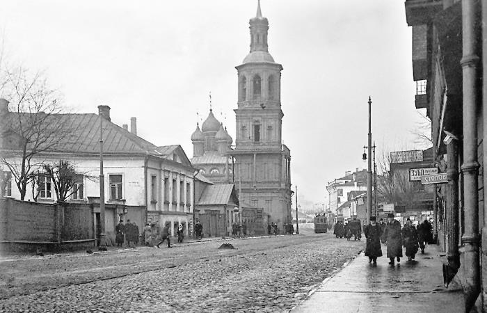 Красная линия Большой Полянки с колокольней церкви Космы и Дамиана в Кадашах на месте дома Бурова. Фотография 1912 г.