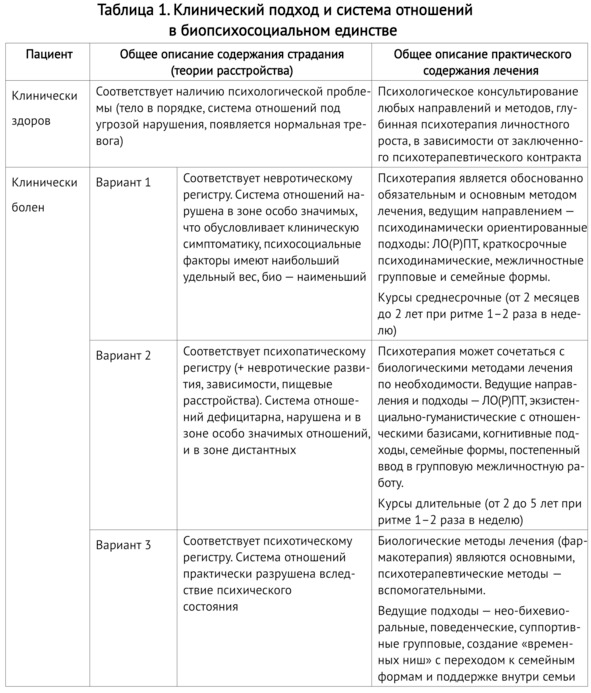 При этом пациент обращается за помощью вследствие страдания, проявленного симптомом, поведением, другими вариантами. Такова реализация биопсихосоциального подхода в медицине. Части биопсихосоциального подхода (данное разделение является условным, с учетом целостности человека) могут иметь определенное соотношение с клиническим состоянием и системой отношений личности. Отсюда логически вытекают необходимые лечебные мероприятия.