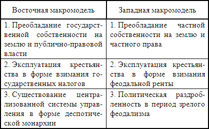 В развитии феодализма у разных народов имелись значительные особенности, которые определялись конкретными историческими условиями жизни, естественно-географической средой и культурными традициями. Модификация общих закономерностей процесса под влиянием экзогенных и эндогенных факторов, проявившаяся в асинхронности временных рамок событий, несовпадении уровней развития отдельных регионов, позволяет выделить восточную и западную макромодели феодализма (табл. 3).