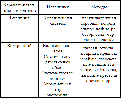 Ускорителем рассматриваемого процесса стало государство, которое осуществляло активную экономическую политику, направленную на утверждение капиталистических отношений и создававшую благоприятную конъюнктуру для их развития. Первоначальное накопление капитала, по меткому замечанию К. Маркса, было записано в летопись человечества мечом и огнем. Это проявилось в существовании особой системы источников и методов поддержки предпринимательской деятельности формирующегося капитализма (табл. 4).
