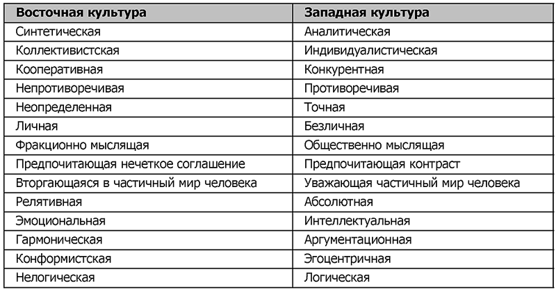 Наиболее часто в литературе культуры подразделяют на восточные и западные. Сопоставление западной и восточной культур показывает значительные различия по многим базовым характеристикам. По своей сути восточная культура является синтетической, созданной на основе не столько взаимодействия, сколько сосуществования различных религиозных и философских систем, которые с точки зрения их носителей отражают взгляды на мир с разных точек зрения. В силу этого жители Востока более склонны признать право других людей на иной образ мысли, что дает им настрой на скорейшего понимание других культур. Западная же культура возникла на основе одной, причем монотеистической – христианской идеологии. Европейцы и американцы стремятся в своем сознании и управленческой практике найти единственно верный универсальный образ действий, который определяется путем аналитического подхода. Они более склонны признать свой образ жизни, если не единственно правильным, то, по крайней мере, лучшим. Для западной культуры характерно только одно решение проблемы – однозначная победа над соперником или средой.