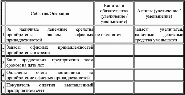 В первом случае изменились только активы: денежные средства уменьшились, в то время как добавились запасы офисных принадлежностей. Один вид активов был заменен другим.