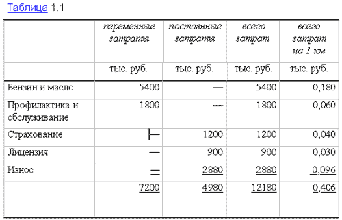 Хотя суммарные затраты на 1 км составляют 0,406 руб., нельзя считать 40,6 руб. дополнительными затратами для пробега следующих 100 км. Единственными дополнительными затратами оказываются переменные. При их размере 0,24 руб. на км дополнительные затраты составят 24 руб. Однако можно возразить, что в течение такого короткого пробега переменные затраты будут состоять только из затрат на бензин и масло. Учитывая, что они равны 0,18 руб. на 1 км, суммарные затраты на пробег составят 18 руб.