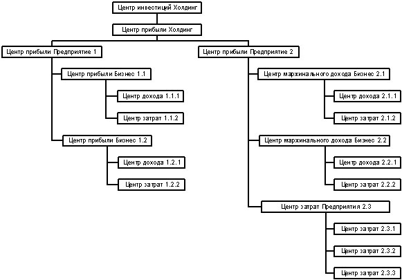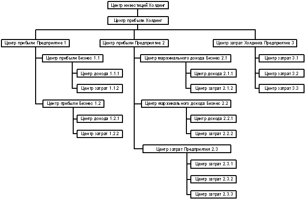 Самый верхний уровень – Центр инвестиций. Это либо предприятие, либо головная компания многоуровневой корпорации. В него входят все остальные центры. Сначала (на втором уровне) это будет Центр(ы) прибыли. Это тоже (как правило) означает уровень предприятия. Если предприятие существует в одном лице, то оно – Центр прибыли самому себе, либо если несколько предприятий (например, дочерних) входят в холдинг, то каждое является Центром прибыли.