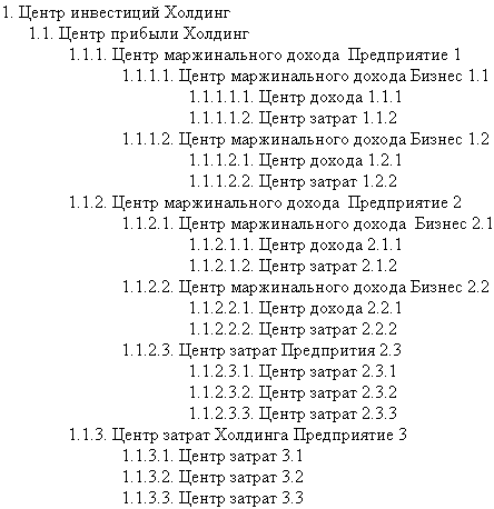 Во всех представленных структурах рассмотрены конфигурации Центров прибыли и Центров маржинального дохода как наиболее сложных. Конфигурации Центров дохода и Центров затрат представлены в них как составляющие их элементы со своей внутренней структурой вложенности и поэтому отдельно не рассматриваются.