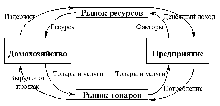 Предприятия, покупая ресурсы у населения, действует как покупатель, а реализуя готовый товар, как продавец. Таким образом, домохозяйства и предприятия связаны двумя рынками: ресурсов и товаров. Навстречу потоку факторов производства, товаров и услуг, движущемуся на схеме против часовой стрелки, движутся деньги (доходы от факторов производства, потребительские расходы, предпринимательские доходы и затраты на ресурсы).
