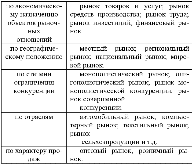 Структура рынка – это внутреннее строение, расположение, порядок отдельных элементов рынка, их удельный вес в общем объеме рынка. Классификация структуры рынка показана в таблице 9.