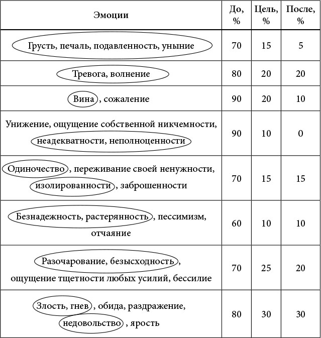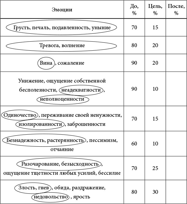 До какого уровня она опустила бы интенсивность всех чувств, начиная с депрессивных? Насколько грустной и подавленной она хотела бы чувствовать себя в конце нашей встречи? Каким мог бы быть приемлемый уровень с учетом всех ее страданий? Мария сказала, что 15 % – достаточный уровень депрессивных переживаний, и вписала эту цифру как цель во второй столбик ежедневника настроения (см. таблицу ниже). А еще она решила снизить тревогу с 80 до 20 %, поступив подобным образом и с остальными чувствами.