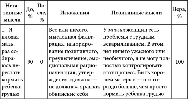 Новую позитивную мысль, которую она озвучила бы близкой подруге, Мария записала в свой ежедневник настроений и отметила, что верит в нее на сто процентов (см. таблицу ниже). Потом я попросил ее заново посчитать, насколько она уверена в своих негативных мыслях. Оказалось, на ноль процентов.
