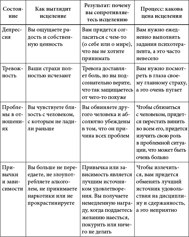 Почему, когда дело доходит до депрессии, мы оказываемся в тупике? Почему мы сопротивляемся переменам? Посмотрите еще раз на таблицу сопротивления: исцеление от депрессии требует принятия истины (о себе или о мире), к которой мы не готовы. Как сказал Будда две с половиной тысячи лет назад, мы страдаем, потому что говорим себе, что нуждаемся в чем-то конкретном, чтобы ощутить счастье и удовлетворение. Например, мы можем думать, что счастье должно быть подтверждено чем-то внешним: деньгами, успехом, любовью, популярностью или славой. Или мы можем думать, что счастье появится лишь после того, как мы достигнем идеала или определенного статуса.