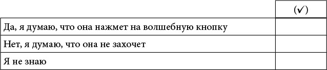 Сначала Бию, скорее всего, скажет, что хочет нажать на волшебную кнопку (почти все хотят!), но, когда она осознает, что за этим стоит, скорее всего, расхочет. И вот почему: волшебная кнопка даст ей чувство счастья, но не изменит ее жизнь. Она так и останется не самой успешной студенткой. Изменятся лишь ее чувства. Она будет чувствовать радость вместо тяжелых депрессивных переживаний.