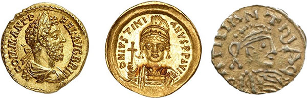(Слева – ауреус II века н. э. В центре – солид Юстиниана. Справа – тремисс Меровингов. Все монеты – в идеальном состоянии. Почувствуйте разницу.)