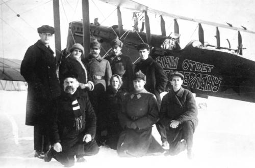 Я.И. Алкснис (сидит второй справа) у борта самолета «Наш ответ Чемберлену»