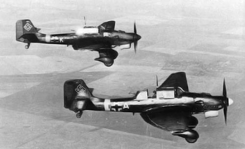 Пикировщик выруливает на старт. Видны лежащие около другого самолета бомбы SC50