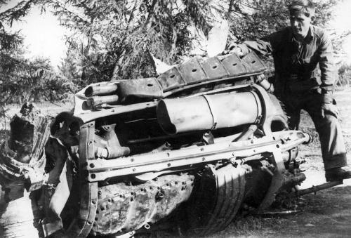 Капитан К.Н. Титенков у двигателя Jumo211 с поверженного «хейнкеля»