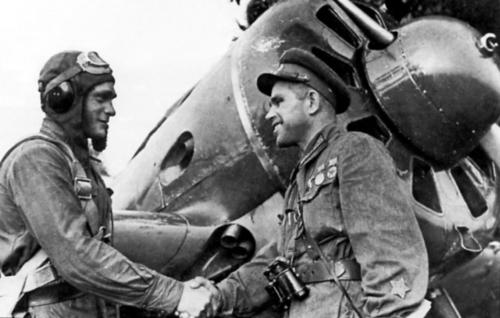 Лейтенант Д.С. Титаренко из 19-го иап докладывает бригадному комиссару Ф.Ф. Верову о победе, одержанной 6 июля 1941 г., когда был сбит «юнкерс»