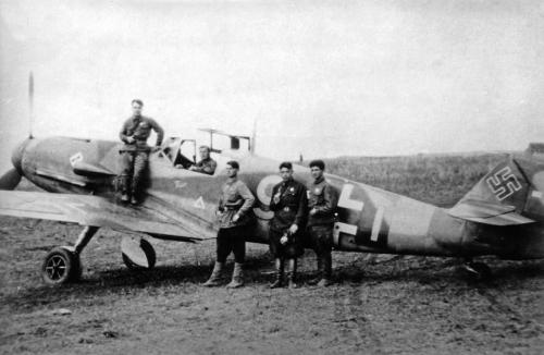 Летчики 43-го иап у Bf109F из III/JG3, приземлившегося на аэродроме Семиполки после израсходования горючего