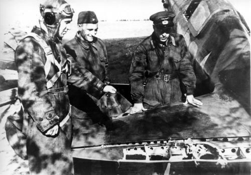 Ст. лейтенант П.И. Тарасов из 15-го иап вернулся из боя 19 июля 1941 г. на МиГ-3 с многочисленными пробоинами. Он показывает повреждения машины мотористу Молодежникову (в центре) и воентехнику Кириллову (справа)