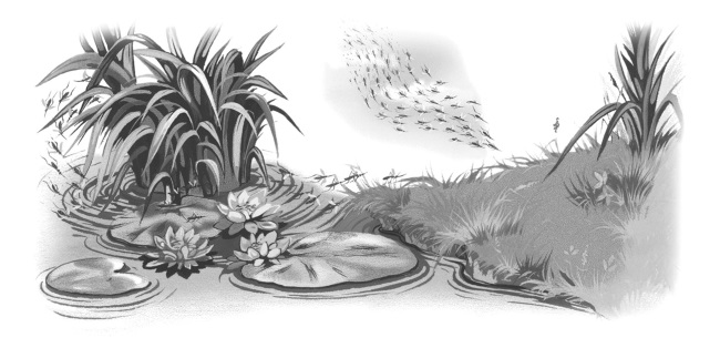 Впрочем, наступила ночь, и все козявочки попрятались в камышах, где было так тепло. Высыпали звёзды на небе, взошёл месяц, и всё отразилось в воде.
