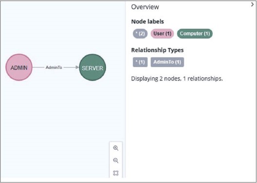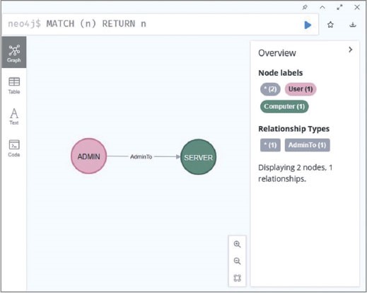 Обычно результаты запросов представляются в виде графов, что удобно для обнаружения связей между объектами. В некоторых случаях данные могут представляться в виде таблиц, что удобно для анализа данных. В BloodHound объекты домена являются вершинами (узлами) графа, а отношения (связи) между этими объектами – ребрами. Также в neo4j узлы графа маркируются меткой (label) по общему принципу. Это позволяет делать выборку только из необходимой группы объектов. Названия связей определяются по типу (type).