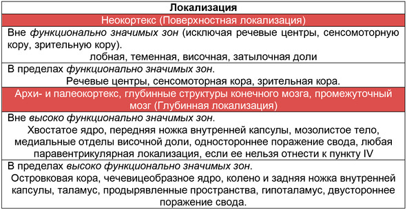 Общепринятой классификации каверном по локализации не существует. В данной работе локализацию каверномы оценивали описательно с указанием доли или структуры, в пределах которой она находилась. Помимо этого, все каверномы были классифицированы с учетом глубины расположения и отношения к функционально значимым зонам согласно классификациям, предложенным Frerich и Malik [45, 82]. В указанных работах выделяют 4 группы локализаций: поверхностные (корковые) вне функционально значимых зон, поверхностные (корковые) в пределах функционально значимых зон, глубинные вне витальных центров, глубинные в пределах витальных центров. К категории «витальные» авторы относят колено и заднюю ножку внутренней капсулы, таламус, гипоталамус и ствол мозга. Мы несколько изменили эту классификацию с учетом собственных клинических данных (таблица 11).