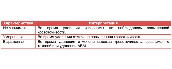 Таблица 14. Оценка кровоточивости мальформации и окружающего мозгового вещества.