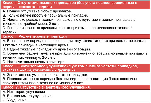 Предложено большое количество как более детальных, так и упрощенных вариантов комбинированной оценки исходов лечения эпилепсии. Больные с каверномами головного мозга часто страдают от редких и очень редких приступов. Поэтому возникновение даже единичного приступа будет расценено больным как отсутствие улучшения. Определенные ситуации можно отнести сразу к нескольким категориям шкалы. Для упрощенной оценки использовали следующие категории: отсутствие припадков после операции, улучшение (снижение количества или более легкий характер приступов), без изменений, ухудшение (учащение или появление более тяжелых приступов) и появление припадков после операции.