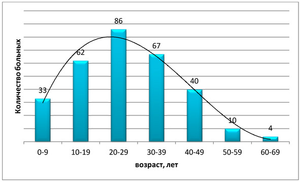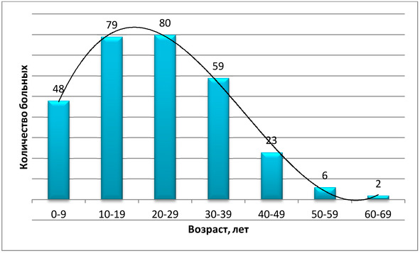 Средний возраст на момент начала заболевания составил 23±12,8 лет. Распределение возраста начала заболевания было типичным для данной патологии и представлено на диаграмме (рисунок 5).
