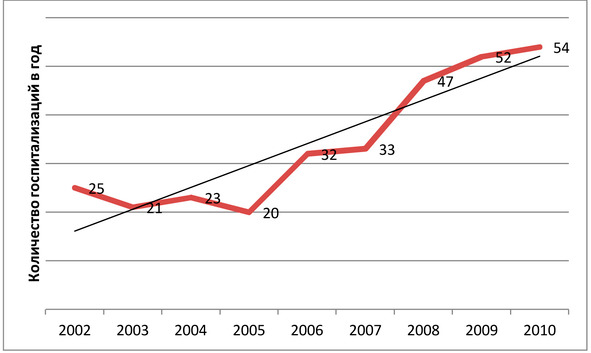 Рисунок 4. Количество госпитализаций больных с каверномами полушарий большого мозга за период с 2002 по 2010 годы.