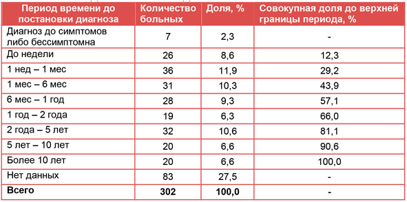 Таблица 16. Распределение больных по времени от начала заболевания до постановки диагноза.