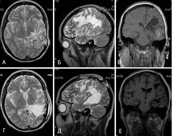 Рисунок 6. Больная Р, 28 лет. До– (а, б, в) и послеоперационные (г, д, е) МРТ в Т1 (в, е) и Т2 (а, б, г, д) режимах.