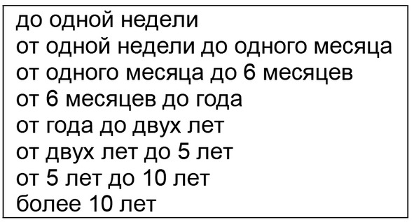 Для выявления закономерностей течения заболевания выделены 4 основных дооперационных временных периода: длительность болезни до выявления объемного образования полушарий большого мозга, длительность болезни до операции, период от первого эпилептического припадка до операции, период от верификации наличия образования до операции. Длительность временного периода для конкретного пациента оценивалась одной из следующих категорий.