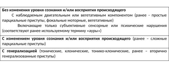 Для фокальных приступов невозможно четкое разделение на типы. В рекомендациях указывается, что на данный момент недостаточно данных для разделения фокальных приступов на определенные типы. Для практических целей, однако, достаточно описательной классификации с оценкой возможности изменения или потери сознания. В таблице 6 приведен упрощенный вариант описания фокальных приступов.