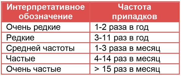 Оценка частоты приступов – плохо освещенный в литературе вопрос. В различных работах авторы придерживаются различных интервалов для определения частоты эпилептических приступов. В таблице 7 приведена одна из классификаций, в течение многих лет используемая в отечественной психиатрии [7]. Данную классификацию мы использовали в работе.