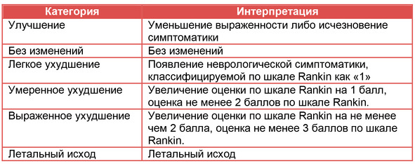 Во всех случаях до и после операции проводили детальную оценку неврологического статуса. Данные интерпретировали согласно модифицированной шкале Rankin (таблица 8) [123, 104]. Следует отметить, что эпилептические приступы – изолированный фактор инвалидизации, влияющий как на повседневную жизнь, так и на трудовую деятельность. Однако, для упрощения последующего анализа, состояние больного по модифицированной шкале Rankin оценивали только исходя из неврологической симптоматики. Анализ эпилептического синдрома проводили отдельно по указанным выше критериям. Категории для сравнительной оценки до и послеоперационного неврологического статуса представлены в таблице 9.
