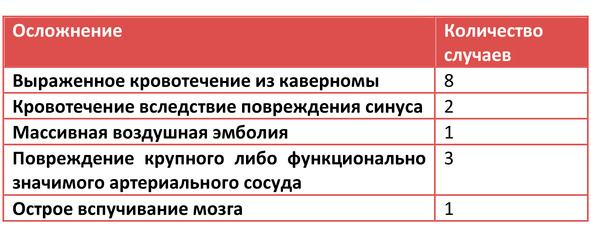 Массивное кровотечение вследствие повреждения синуса зафиксировано в двух случаях. В обоих случаях кровотечение было успешно остановлено. Воздушная эмболия наблюдалась при удалении каверномы теменной доли в положении полусидя. Последствий этого осложнения не отмечено и больной выписан на восьмые сутки.