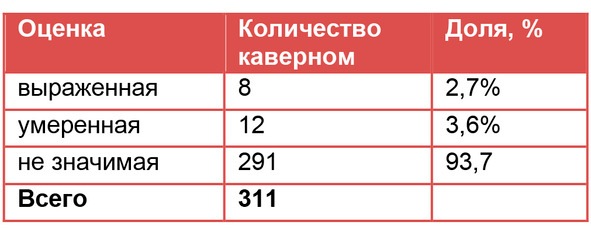 Таким образом, интраоперационное кровотечение редко сопровождает удаление каверномы. Его можно предполагать в случае удаления крупной каверномы с плотной структурой (как правило, два указанных параметра связаны: крупные каверномы часто имеют плотную структуру). Риск повышенной интраоперационной кровопотери также выше при удалении каверном путем фрагментации, которая часто применяется при удалении глубинно расположенных каверном.