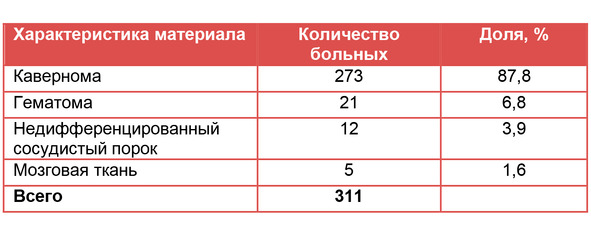 Данные морфологического исследования имелись для всех удаленных образований. Кавернозная мальформация подтверждена в 273 случаях (87,8%). В одном случае выявлена кавернома, сочетанная с АВМ. В одном случае выявлена кавернома и фрагменты ганглиоглиомы в окружающей мозговой ткани. Сгустки крови различной давности либо капсула хронической гематомы выявлены в 21 случае. У двух больных удалены кавернома и гематома. У одного больного, страдающего полиморфными эпилептическими припадками и оперированного дважды, удалены гематомы правой лобной и левой височной доли.