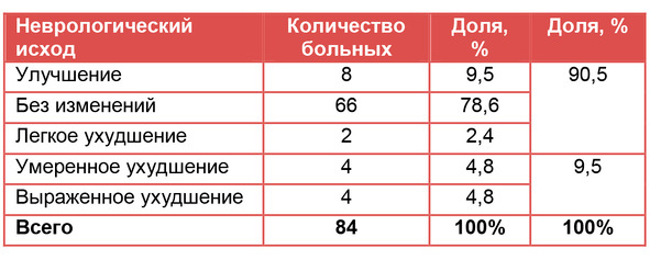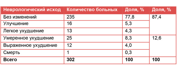 Ближайшие результаты лечения фиксировали на момент выписки. В случае повторных госпитализаций состояние оценивалось на момент последней выписки. Сводные данные по оценке неврологического статуса представлены в таблице 35. Сравнительная оценка до– и послеоперационного неврологического статуса представлена в таблице 36.