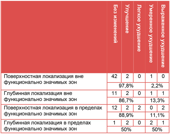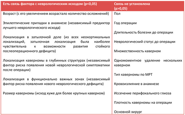 Такие факторы, как пол, год операции, длительность болезни до операции, множественность каверном, одномоментное удаление нескольких каверном у одного пациента, правое или левое полушарие, тип каверномы по данным МРТ, верифицированное кровоизлияние в анамнезе и плотность каверномы не оказывали существенного влияния на неврологический послеоперационный исход. Исходы для больных с имеющимся до операции неврологическим дефицитом были хуже, чем для неврологически интактных пациентов. Стоит, однако, подчеркнуть, что как неврологический статус до операции, так и послеоперационный неврологический исходы зависели от локализации. При исключении влияния этой ковариаты, различие теряло статистическую значимость. Иссечение зоны перифокального глиоза не приводило к ухудшению в неврологическом статусе.